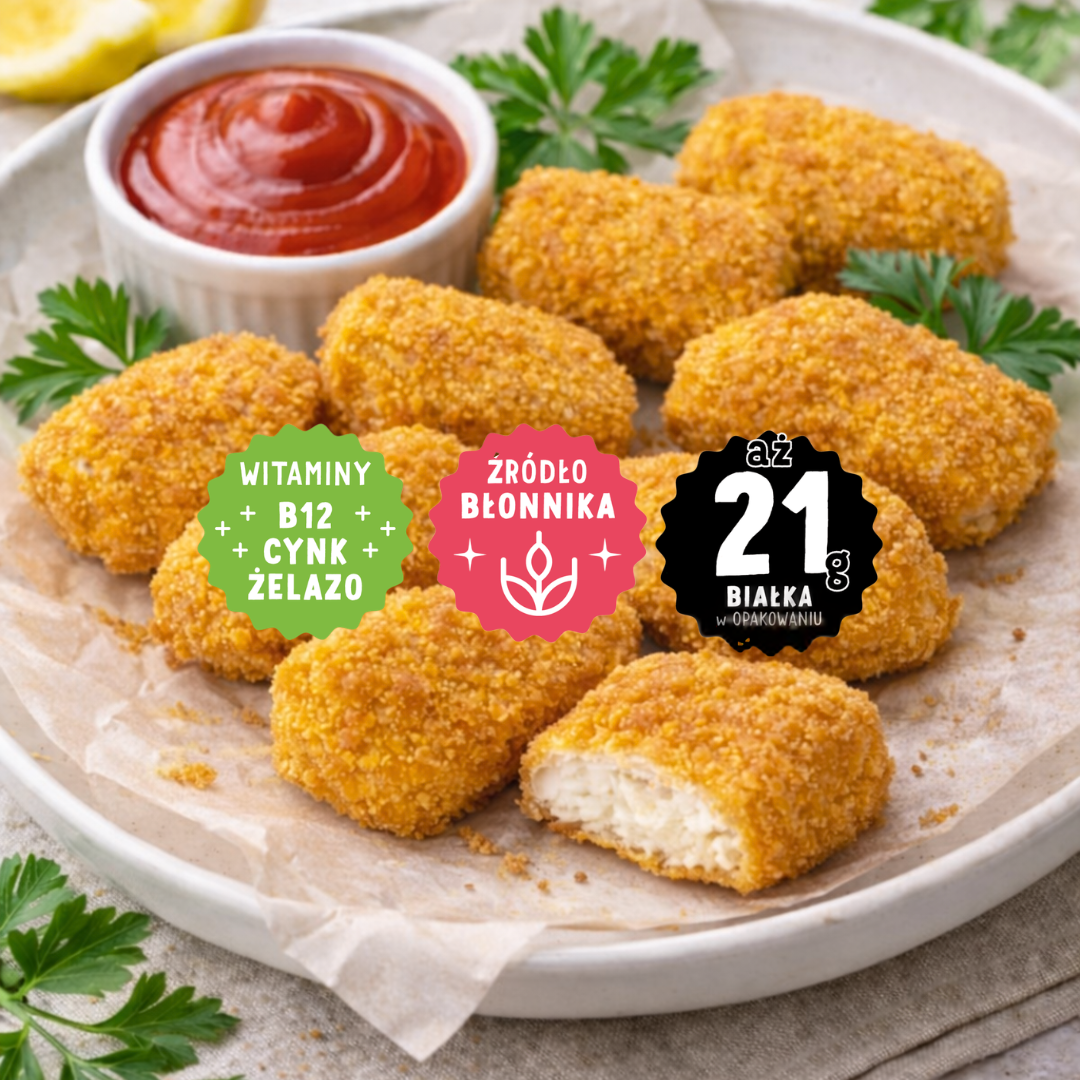 Roślinne nuggetsy w panierce na bazie białka pszennego i grochowego. Do spożycia po obróbce termicznej. Składniki: woda, bułka tarta (mąka pszenna, sól, drożdże, przyprawy), teksturowane białko pszenne 9% (gluten pszenny 7%, mąka pszenna), olej słonecznikowy, białko grochowe 5%, błonnik grochowy, stabilizator: metyloceluloza; aromaty, sól jodowana, regulator kwasowości: ocet buforowany; witamina B12, żelazo, cynk. Może zawierać: soję, seler, musztardę, orzechy.