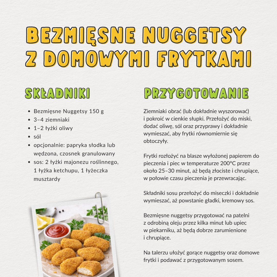 Bezmięsne Nuggetsy świetnie odnajdują się w wielu rolach – jako element obiadu, przekąska do dzielenia się, dodatek do frytek, sałatek lub wrapów. Doskonale smakują solo, ale jeszcze lepiej w towarzystwie ulubionych sosów.